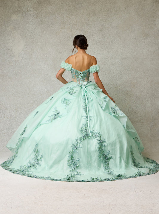 Vestido de Fiesta de Tul Bordado con Brillo y Lentejuelas, Hombros Descubiertos y Escote Corazón, Color Sage