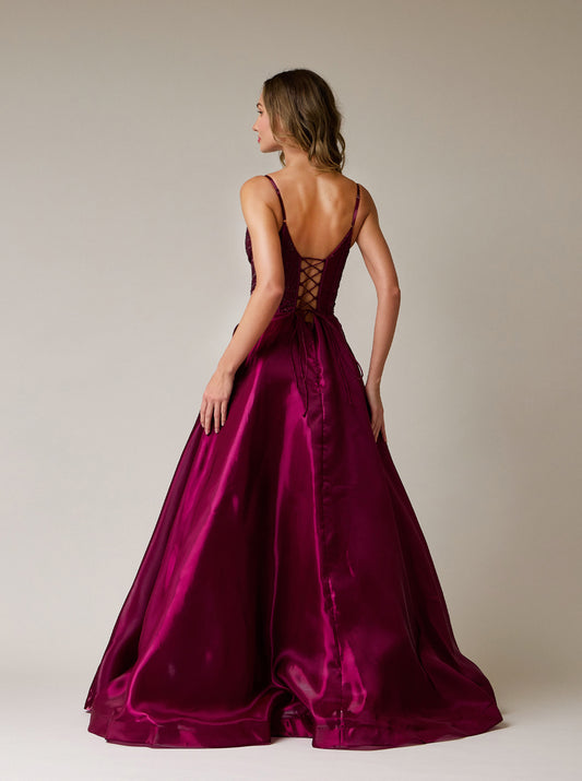 Vestido Corte en A de Organza, con Escote Corazón con Bolsillos y en la Espalda, Color Plum