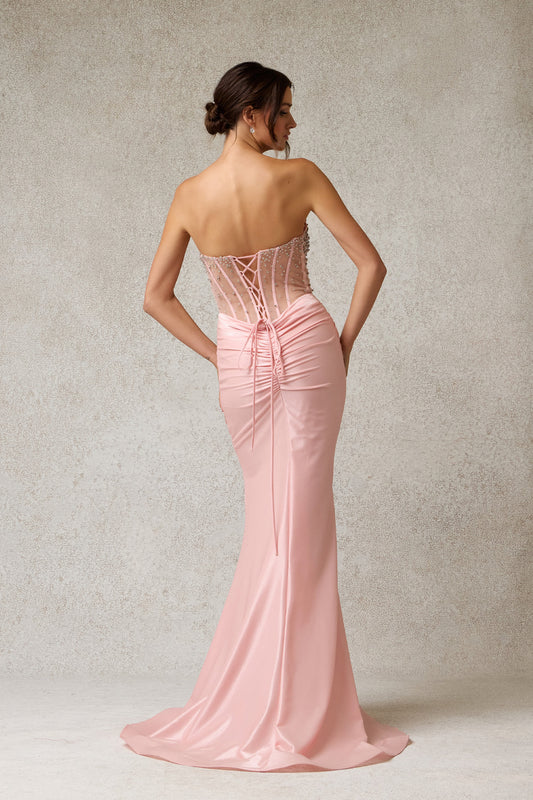 Vestido Corte Sirena Escote corazón con corpiño plisado asimétrico y adornado con cristales. Color Mauve