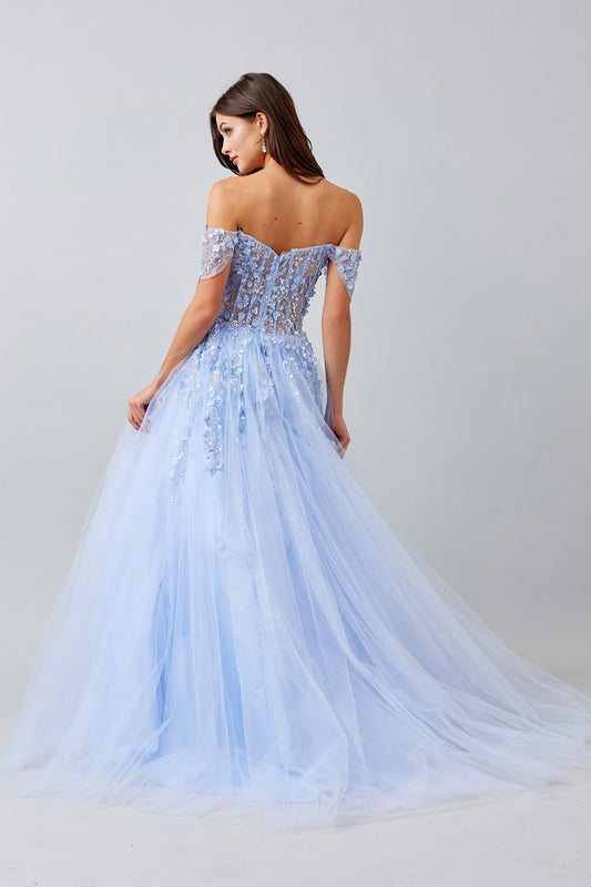 Vestido de Fiesta con Escote de Corazón de Tul Bordado con Cristales y Lentejuelas, Color Ice Blue