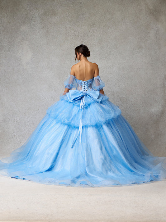 Vestido Corte en A Escote Corazón y Espalda con Cordones Color Ice Blue.