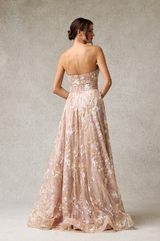 Vestido en Corte A de Tul Estampado con Aplicaciontes de Lentejuelas con Escote de Corazón, Colores Blush y Yellow