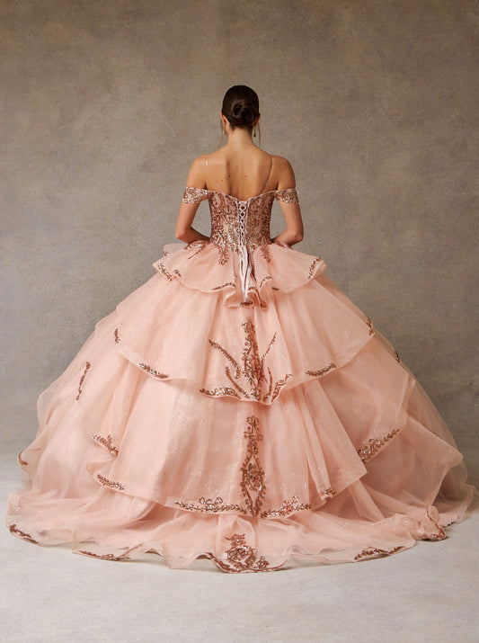 Vestido de Fiesta de Tul con Brillo, Bordado con Cuentas, Escote de Corazón y Hombros Descubiertos, Colores Rose Gold y Royal