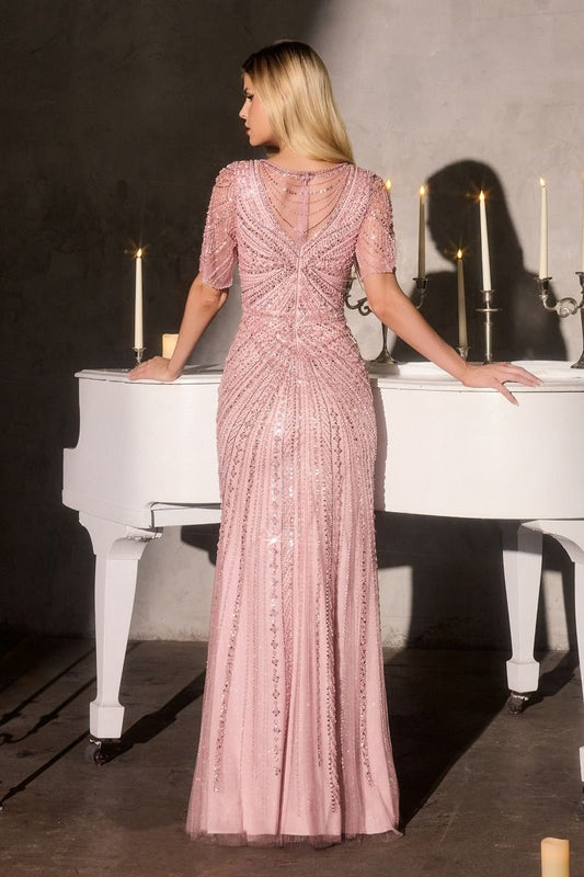 Vestido Recto con Escote Redondo, Mangas con Vuelo y Motivo Lineal con Cuentas, Color Dusty Rose