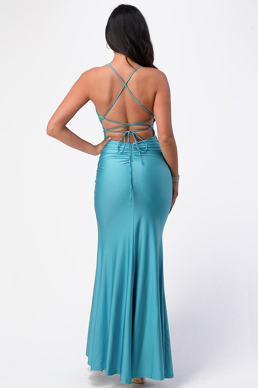 Vestido de dama de honor corte ajustado de tela elástica con un escote sostenido por largos lazos Color Cyan y Emerald.