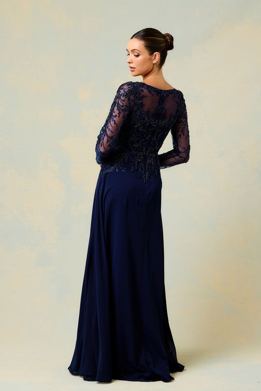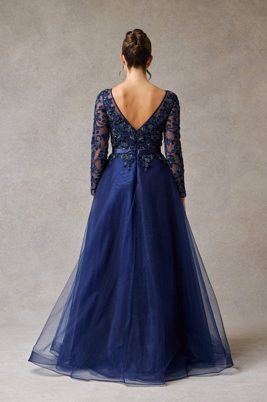 Vestido en Línea A de Tul con Manga Larga detalles de Encaje y Cristales Color Navy.