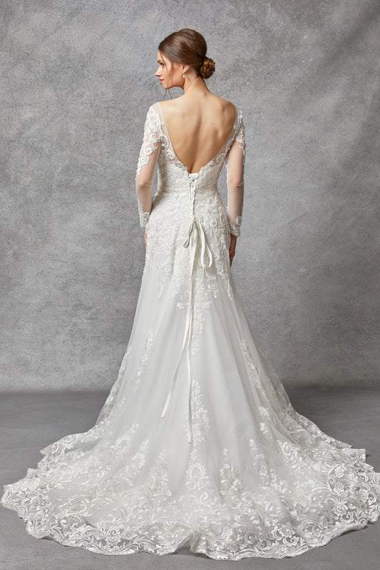 Vestido de Novia con Manga Larga Corte Sirena en Encaje, Color Off White.