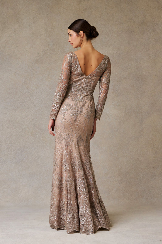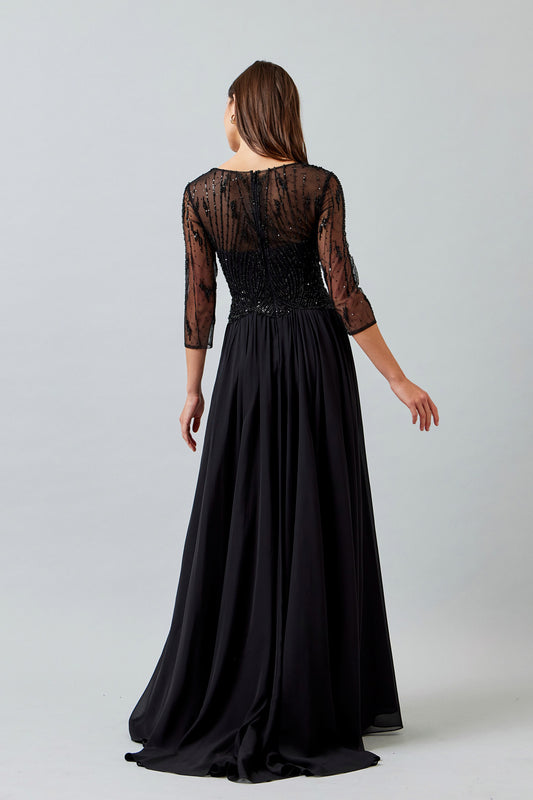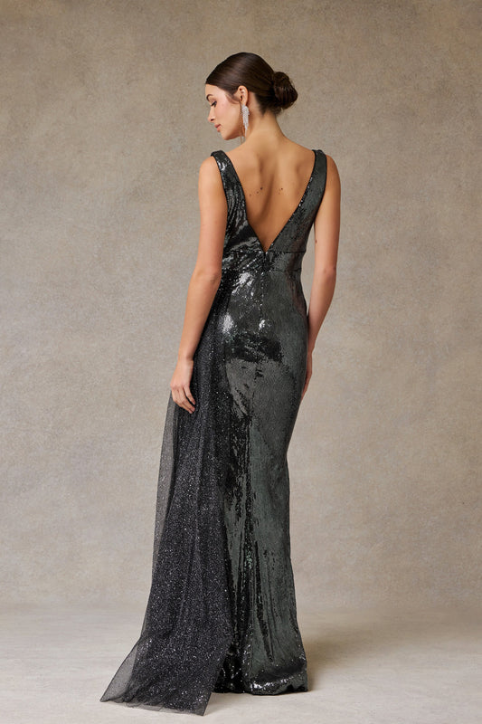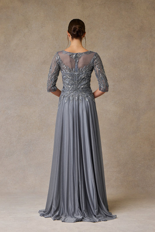 Vestido en Linea A de Gasa Brillante Cuello en V Manga 3/4 con Bordados de Cristales y Lentejuelas color Dark Gray