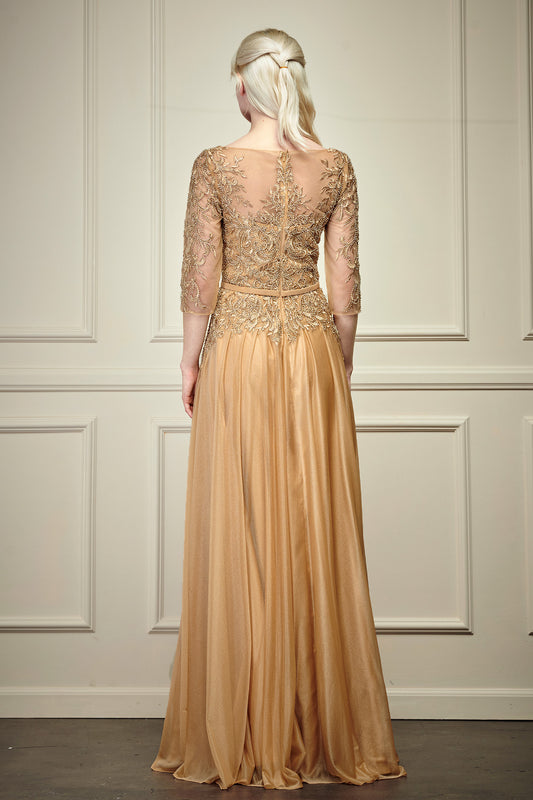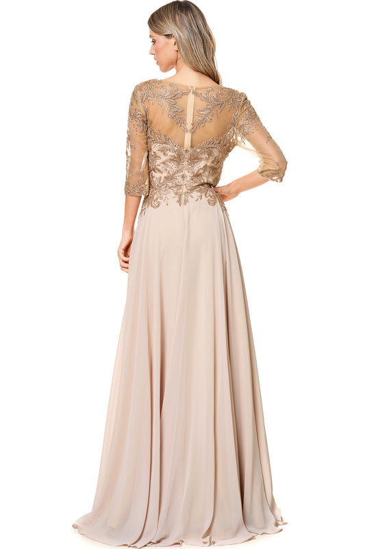 Vestido Largo Recto con Mangas 3/4 Cuello V Aplicaciones en Encaje