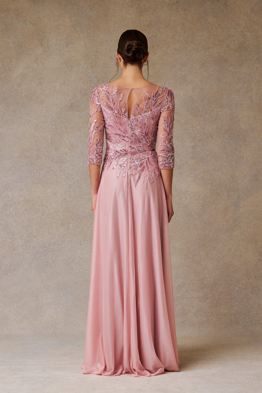 Vestido en Línea A Con Mangas Laras Color Dusty Rose.