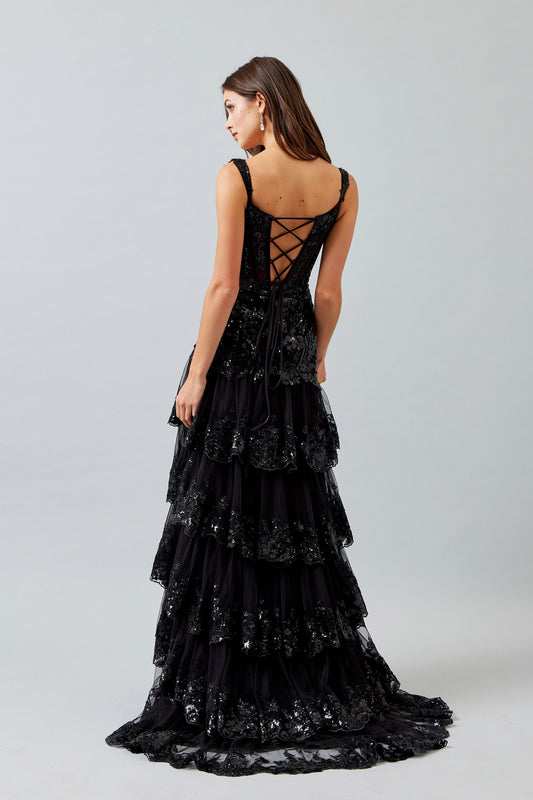 Vestido Corte Sirena a Capas Lentejuelas Con Corsé y Cordones en la Espalda (Dos Colores)