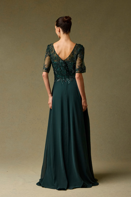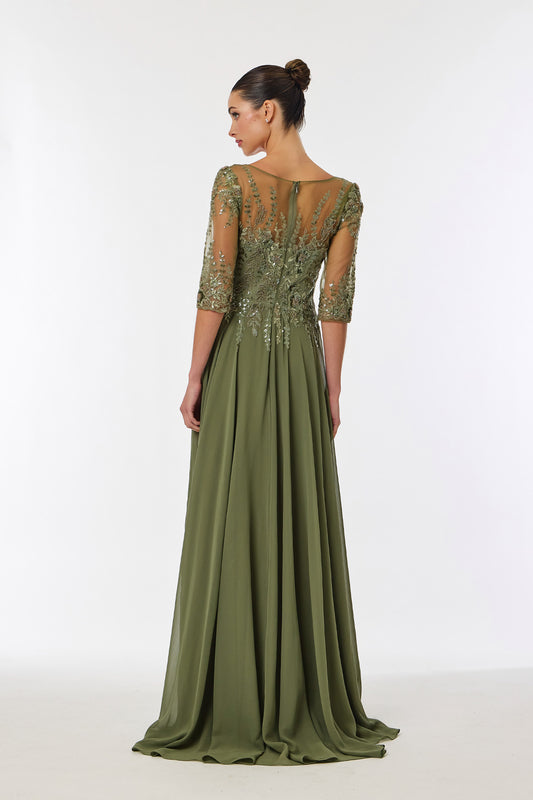 Vestido de Chiffon, Corte en A, Mangas 3/4. Escote en V, Con Corpiño Bordado, Color Olive
