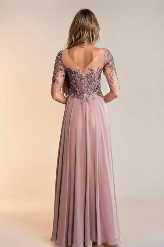 Vestido de Chiffon Corte en A, Escote Redondo, Mangas 3/4, Corpiño Bordado con Lentejuelas (Varios Colores)