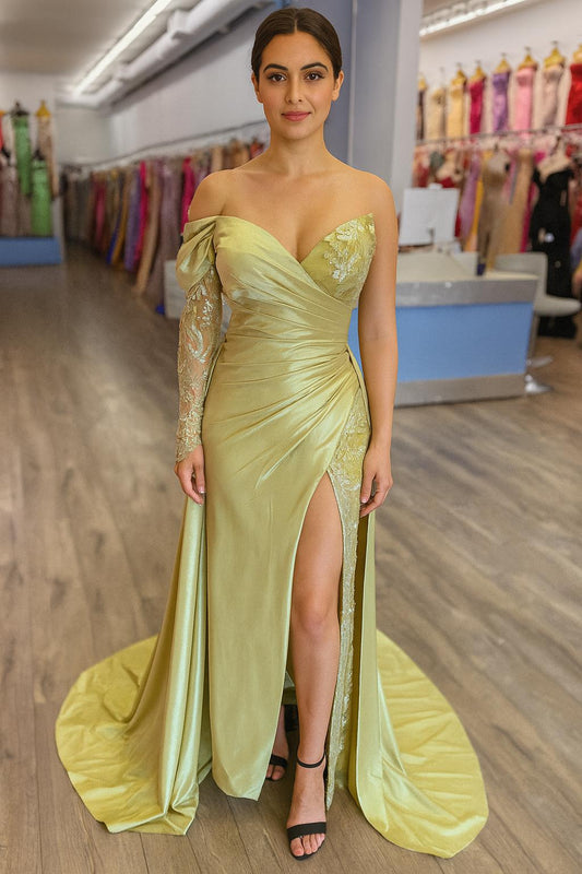 Vestido de Satén a un Hombro con Manga Larga, Escote en V, Cintura Fruncida y Abertura en la Pierna (Varios Colores)