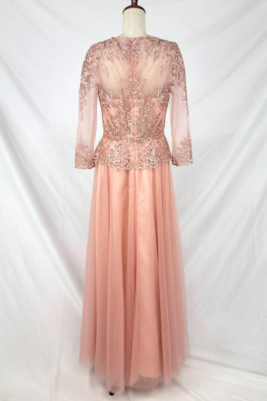 Vestido con Escote Ilusión, Mangas Largas, Corpiño con Apliques, Abertura en la Pierna y Cintura Plisada.(Varios Colores)