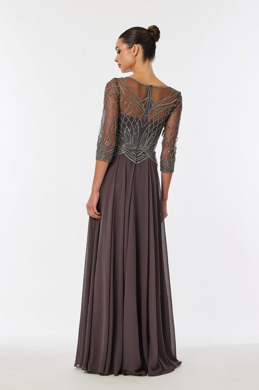 Vestido en Corte A, Cuello en V con Mangas y Aplicaciones de Cuentas y Cristales, Color Charcoal