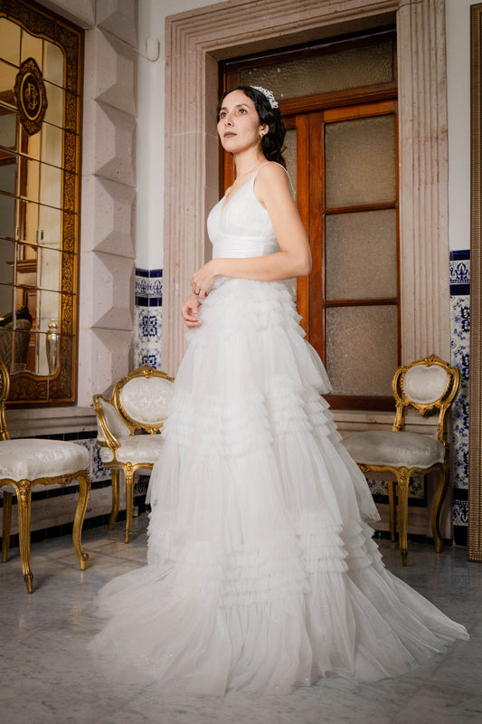 Vestido de Novia en Línea A de Tul a Capas con Cuerpo y Corsé.Precio habitual $ 5,299.00 MXNPrecio habitualPrecio unitario por-
