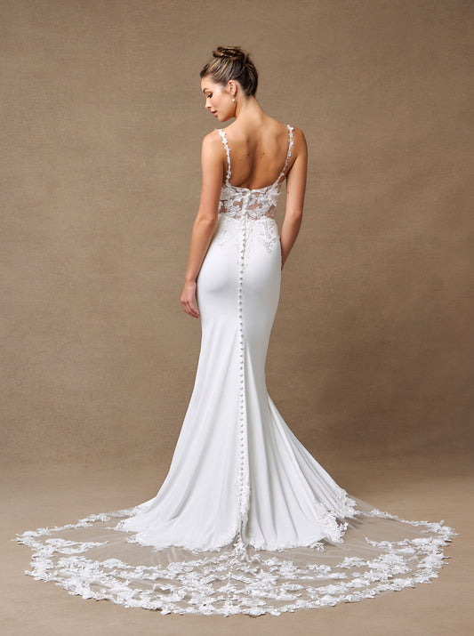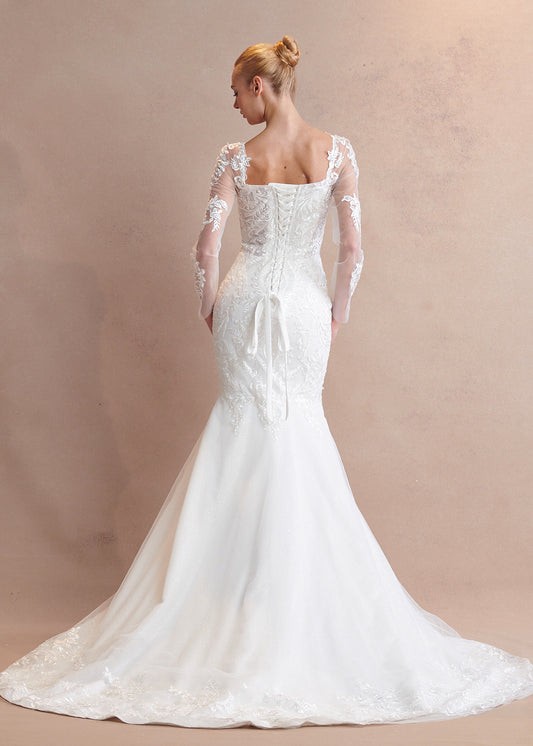 Vestido de Novia corte Sirena Con Detalles Florales de Encaje y Abertura en la Pierna.