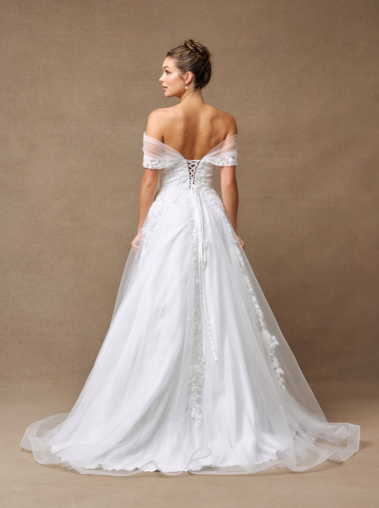 Vestido de Novia En Línea A Con Hombros Fuera Escote Corazón y Hombos de Fuera.