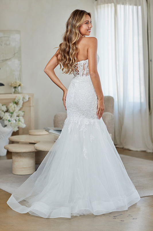 Vestido de Novia Corte Sirena Sin Tirantes y con Cola Off White.