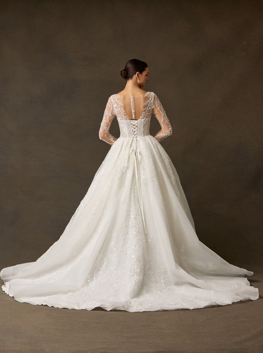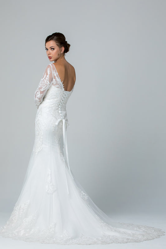 Vestido de Novia de Tul Bordado, Corte en A, Escote en V, con Manga Larga, Color Off White