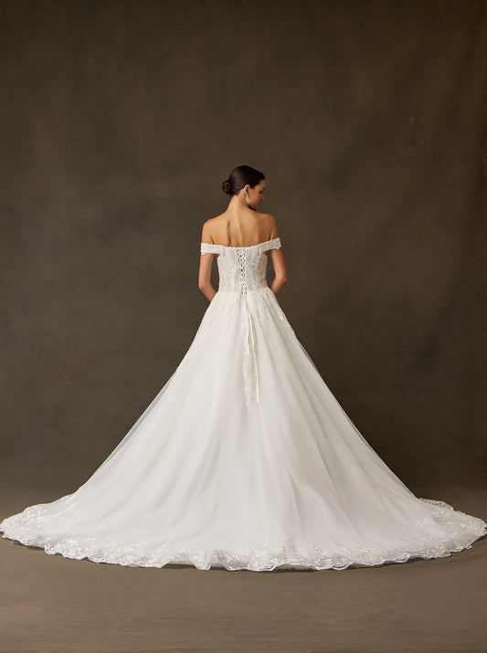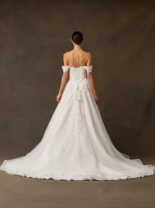 Vestido de Novia Linea A hombros descubiertos, escote corazón, cierre de cordones en la espalda y cola.