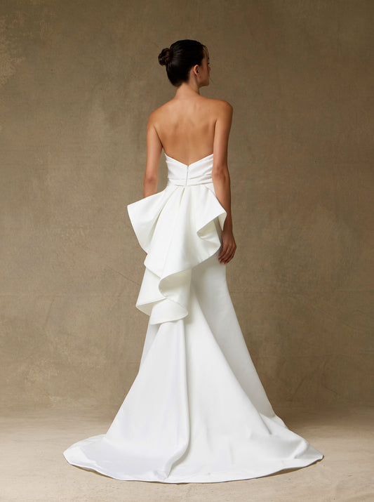 Vestido de Novia Escote de corazón sin tirantes, corpiño con ballenas, abertura en la pierna y bolsillos.