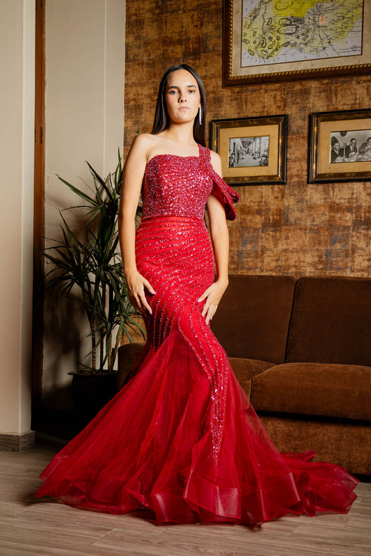 Vestido corte de Sirena con un tirante Color Rojo.