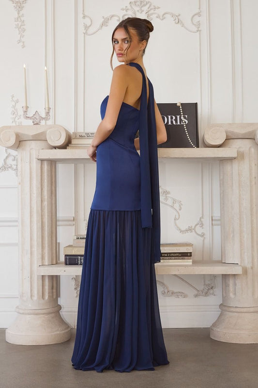 Vestido con Corpiño Plisado y Adorno en Cintura con Aplicaciones de Cuentas y con Abertura en la Pierna. (Varios Colores)