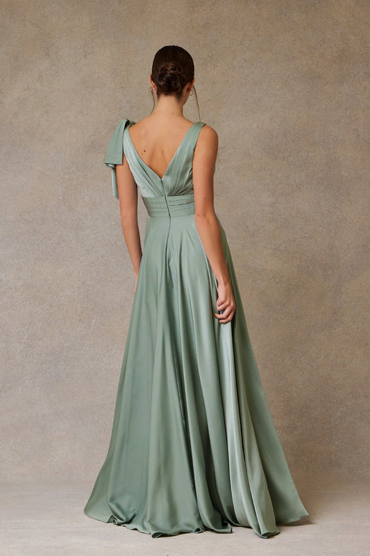 Vestido de Satén en Línea A Cuello V Color Sage.
