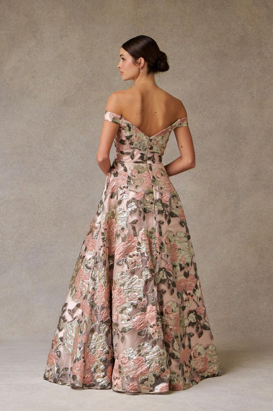 Vestido en Corte A, Cuello en V, Hombros Descubiertos con Bolsillos Laterales, Color Blush Sage Print