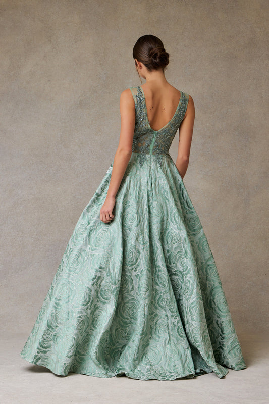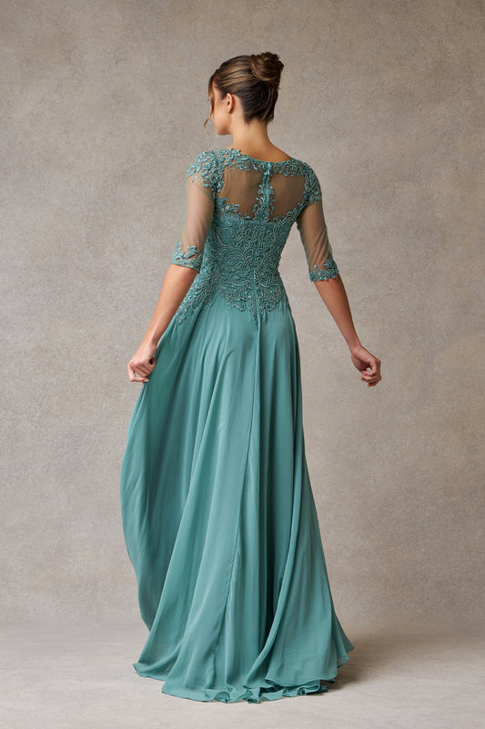 Vestido Largo en Corte A con Mangas 3/4, Escote en V y Bordados con Pedrería (Varios Colores)