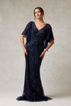 Vestido Con Escote en V, Manga Corta, de Tul con Aplicaciones en Cristales y Lentejuelas, Color Navy