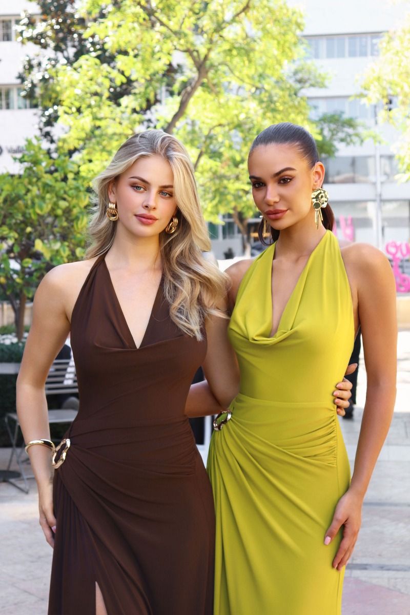Vestido con Escote Halter, Detalle de Fruncido en la Cadera con Aro Dorado y Abertura en la Pierna (Varios Colores)