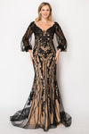 Vestido Corte Sirena con Escote en V y Mangas Largas,Tejido de Malla con Pedreria (Varios Colores)