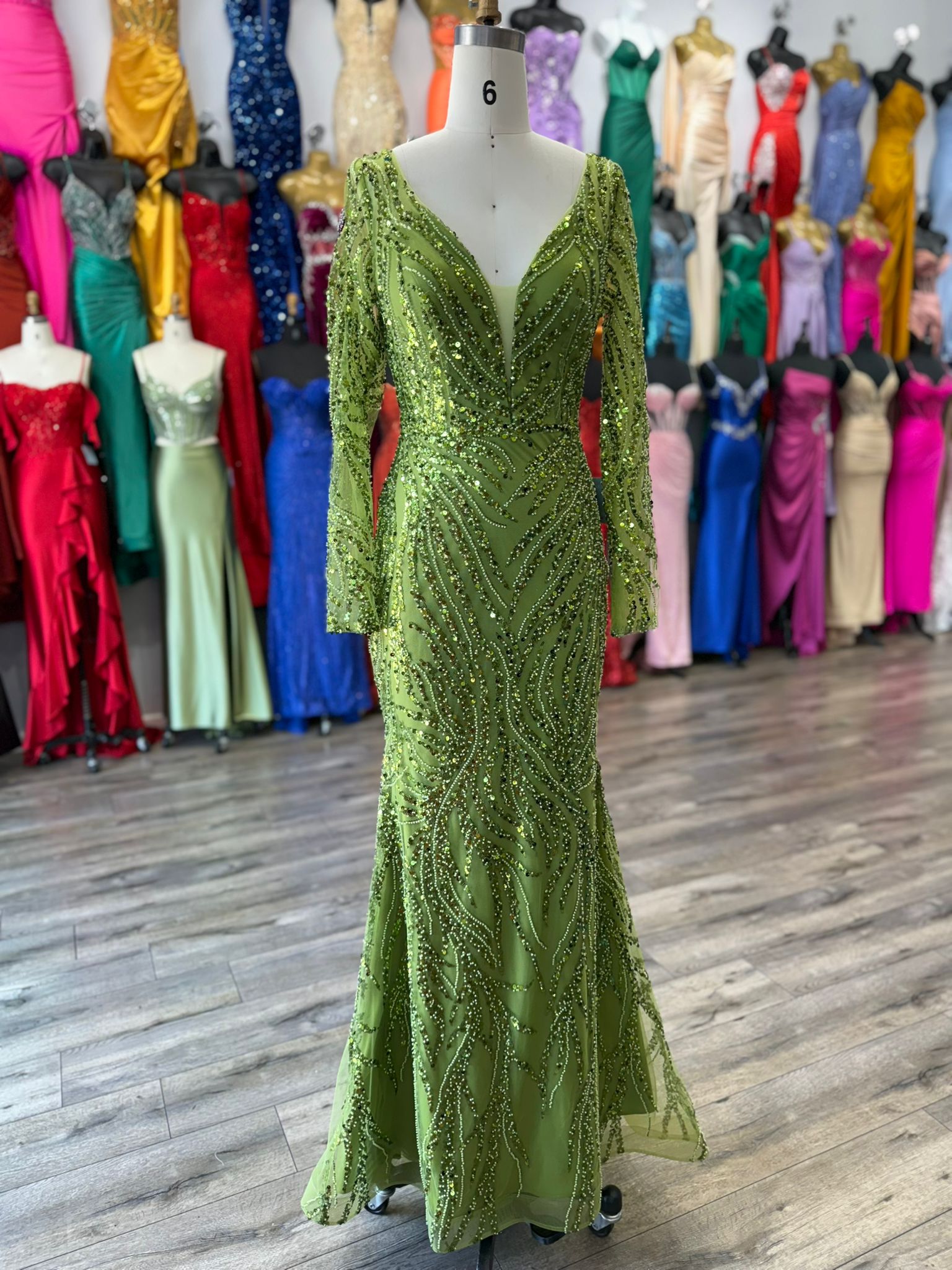 Vestido Corte Sirena con Escote Profundo en V, Manga Larga y Aplicaciones en Lentejuelas (Varios Colores)