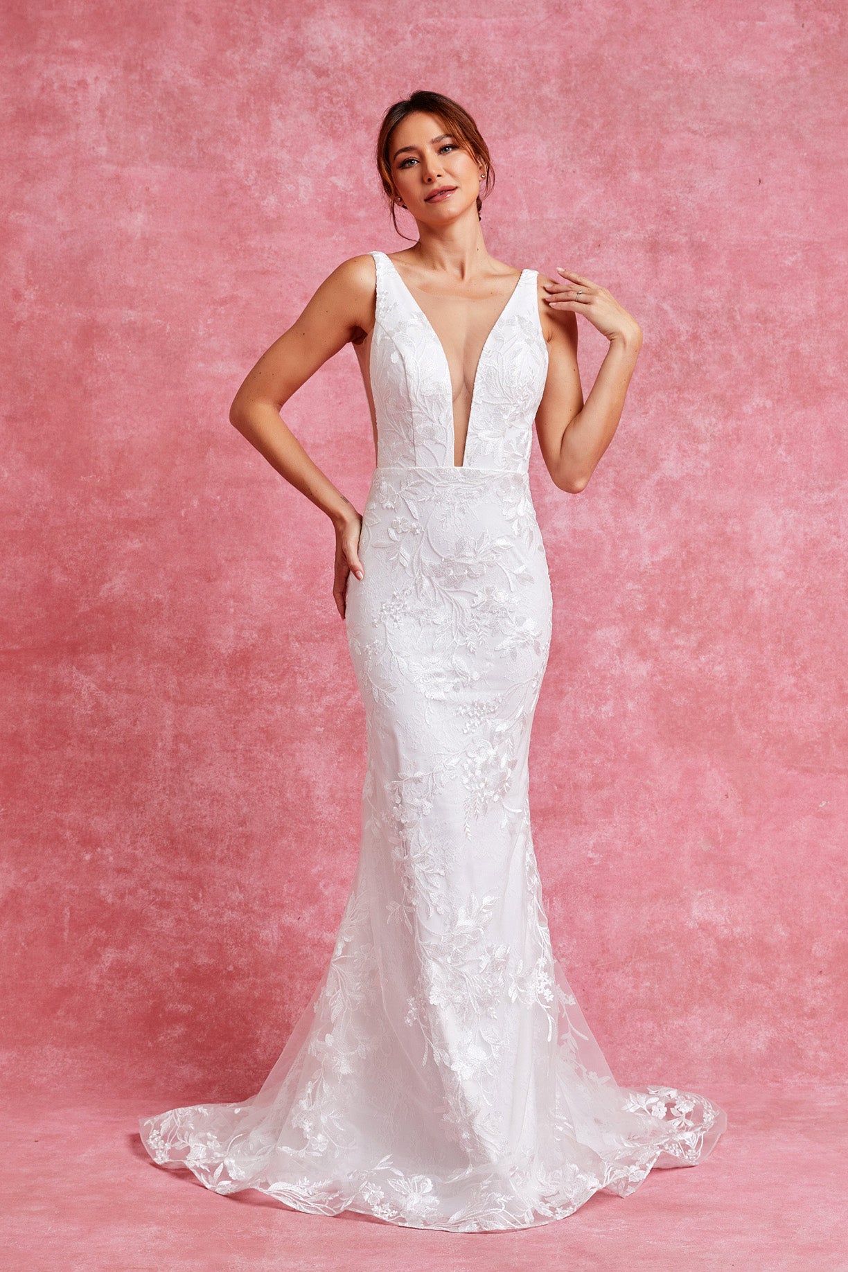 Vestido Corte Sirena Sin Mangas Cuello V y Cola.