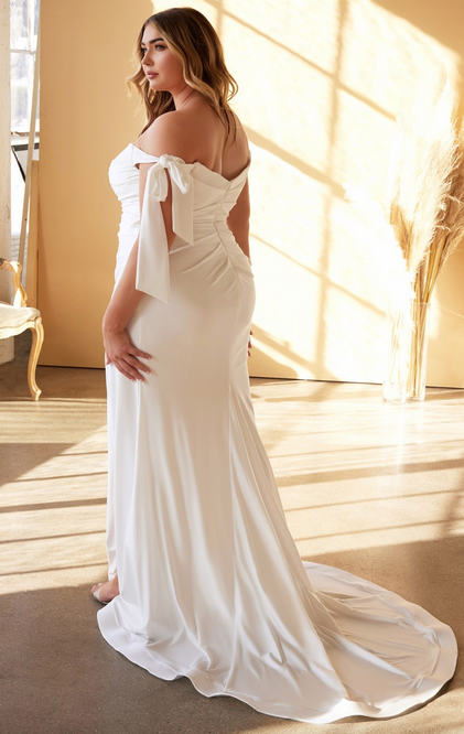 El corpiño de escote corazón está estratégicamente metido y plisado a lo largo de la cintura para acentuar tus curvas y las mangas alargadas anudadas enmarcan el escote con los hombros descubiertos. La falda se ensancha hasta un dobladillo de cola de pez que se acumula en el piso definido por una espectacular abertura frontal para que puedas trabajar en la habitación con facilidad. El ribete de crin estabiliza el dobladillo.