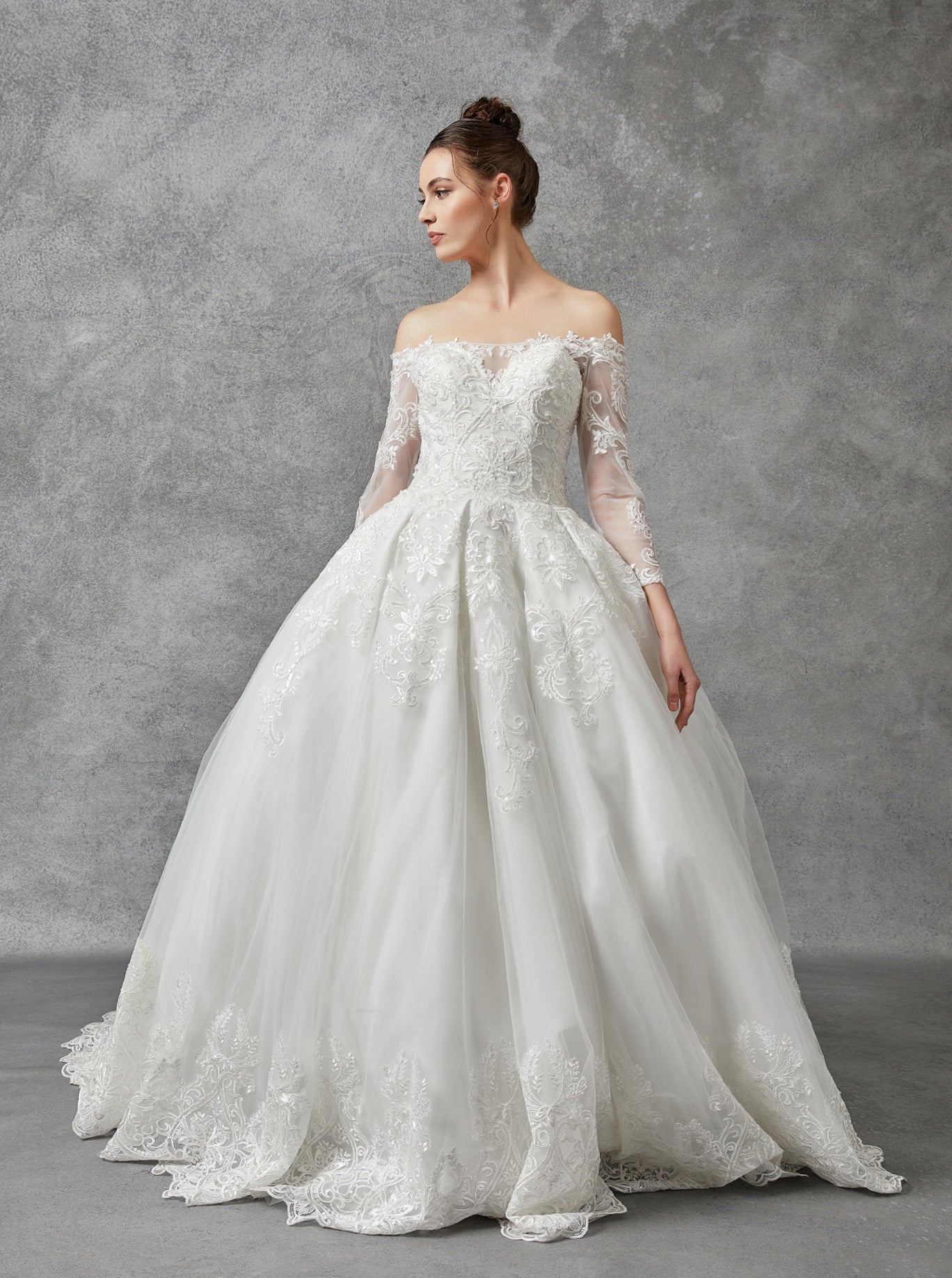 Vestido de Novia Bordado con Cuentas y Lentejuelas con Manga Larga al Hombro, Color Off White