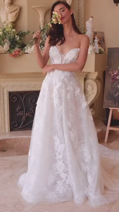 Este encantador vestido de fiesta presenta un profundo escote en forma de corazón sin tirantes y está adornado con intrincados apliques de encaje floral, creando un impresionante look nupcial. Confeccionado con encaje en capas y detalles florales, el vestido ofrece una elegante silueta en forma de A que realza tu figura. Ideal para un vestido de novia o vestido de novia, este diseño combina elegancia romántica con sofisticación atemporal.