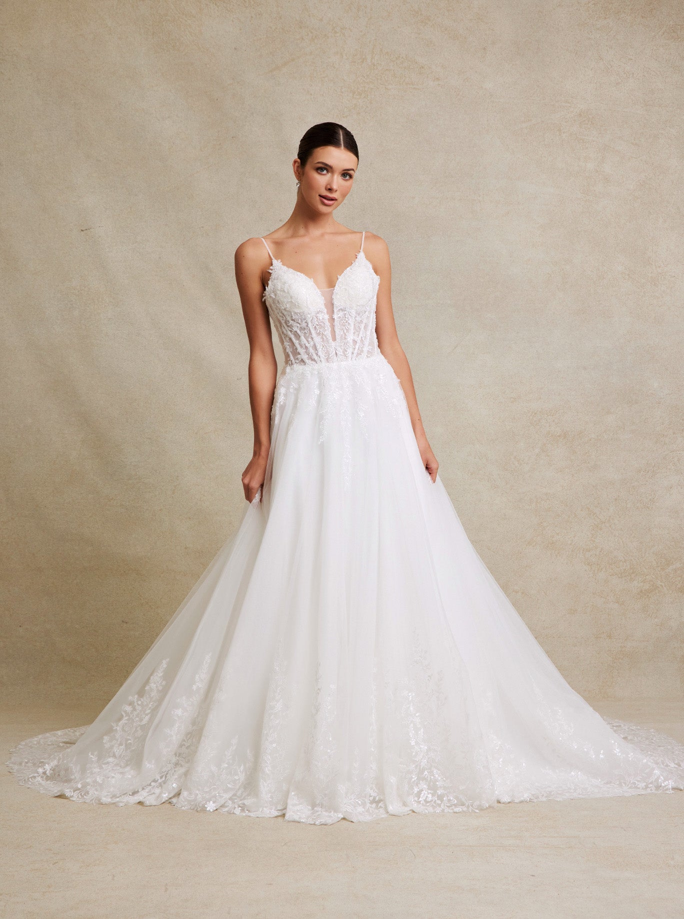 Vestido de Novia con Escote Pronunciado en V de Encaje Bordado con Cuentas y Lentejuelas, Color Off White