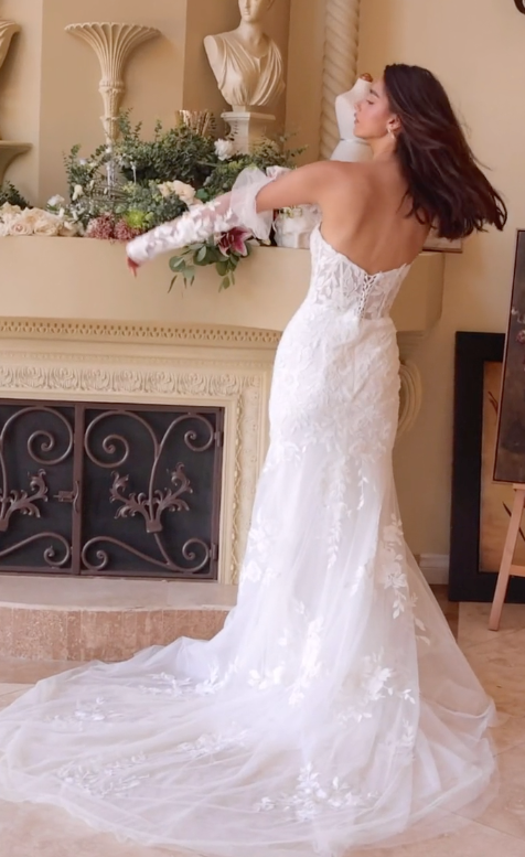 Este vestido de novia estilo sirena sin tirantes presenta un escote corazón profundo con apliques de encaje floral, creando un look romántico y elegante. El tul en capas añade textura y volumen, mientras que la espalda tipo corsé con cordones garantiza un ajuste favorecedor. Completo con guantes largos removibles a juego, este vestido es perfecto para un momento nupcial atemporal.