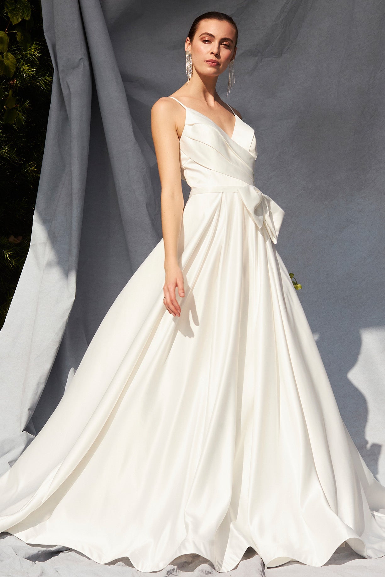 Vestido de Novia de Satén, Corte en A, con Tirantes, Escote en V y Lazo Desmontable, Color Off White