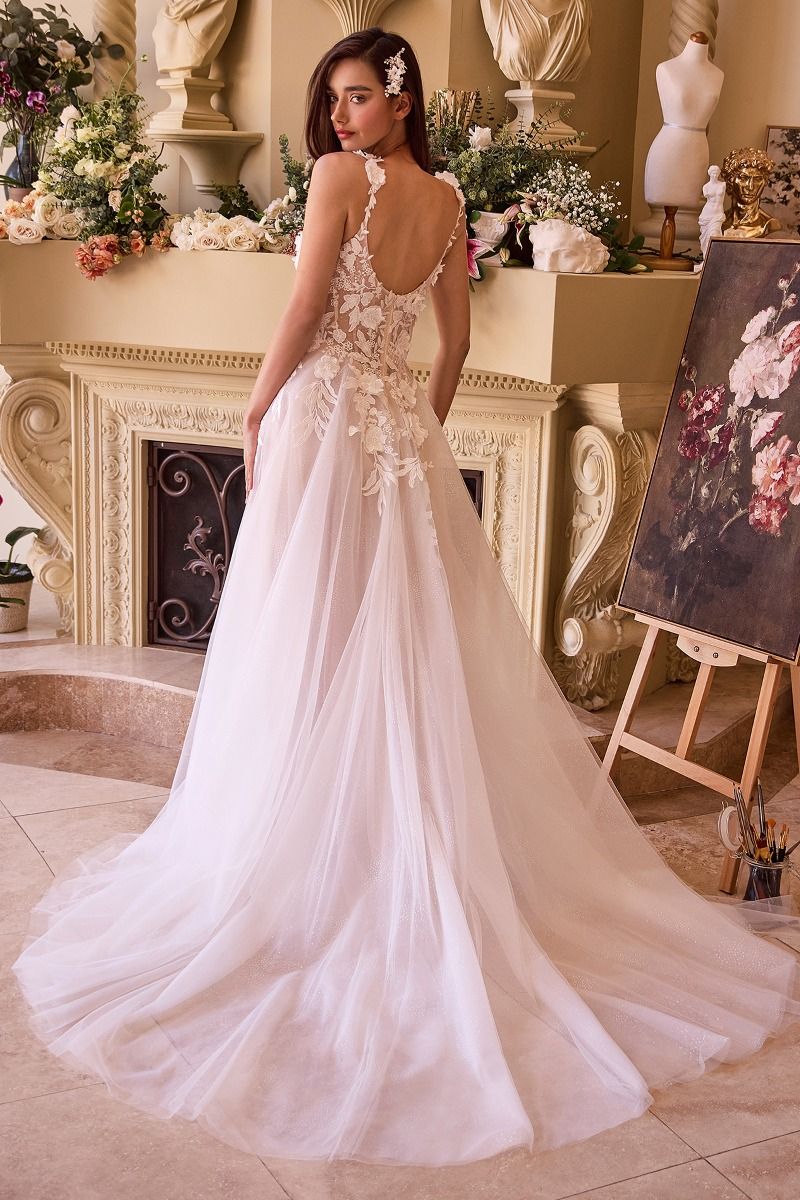 Encantador vestido de novia de corte A. La aplicación de encaje dimensional adorna el corpiño y la parte superior de la falda, creando un efecto delicado y etéreo. El escote corazón, adornado con encaje a juego, añade un toque de elegancia atemporal, mientras que los tirantes finos proporcionan una sujeción delicada. La espalda abierta revela un toque de encanto, equilibrando perfectamente el encanto clásico del vestido. La falda de tul en capas fluye sin esfuerzo, evocando sueños de cuentos de hadas y elegantes valses. De color blanquecino con un forro nude asomando, este vestido combina maravillosamente tradición y modernidad. Camina hacia el altar con este impresionante vestido y deja que el día de tu boda se convierta en una historia de romance y belleza.