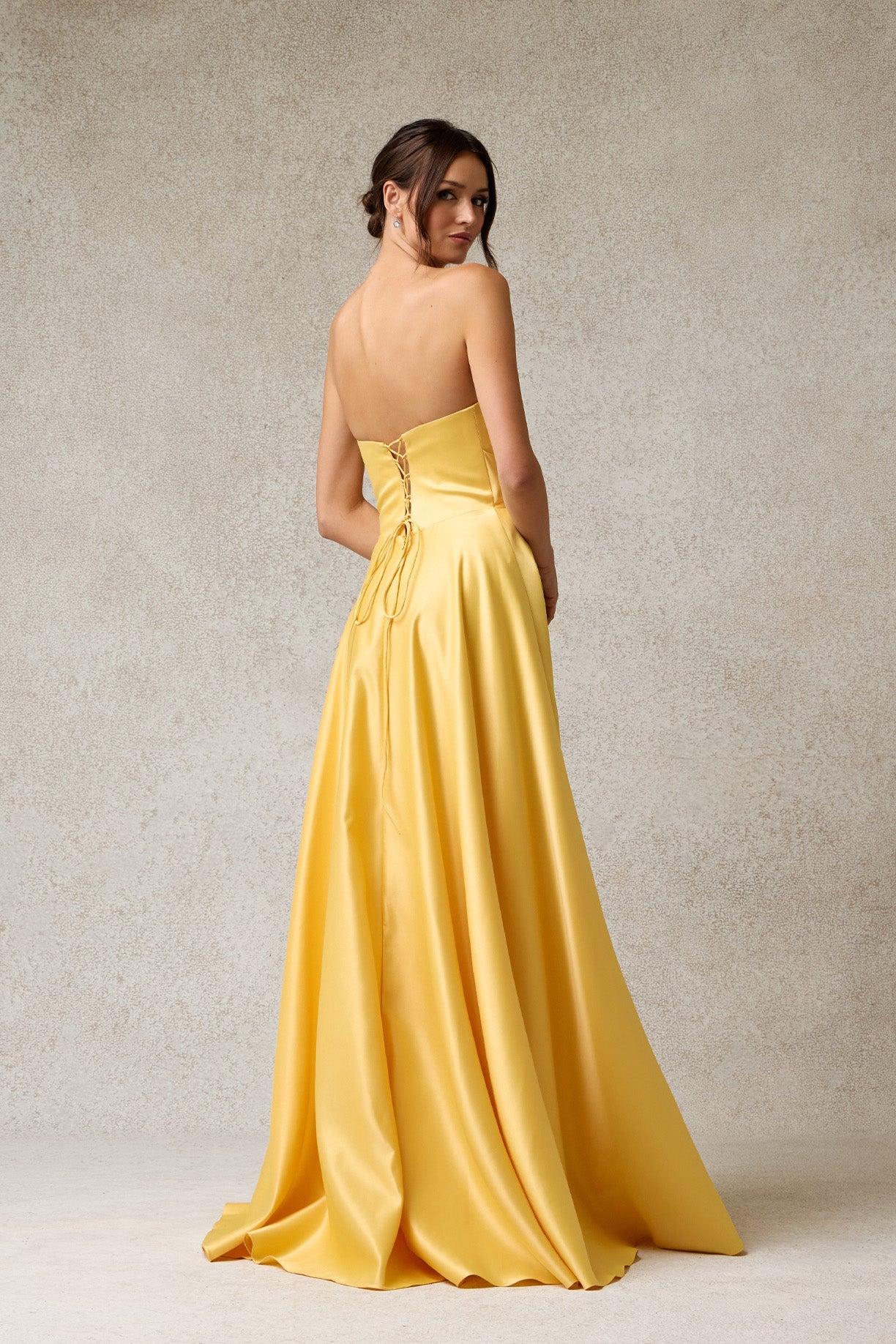 Vestido de Satén con Escote Drapeado y Detalle de Moño a Un Costado, Colores Ice Blue y Yellow