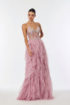 Vestido de Tul con Falda en Olanes y Corsé con Encaje, Cuentas y Lentejuelas, Color Mauve