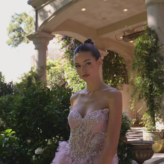 Diseñado para encarnar la esencia de un cuento de hadas, este voluminoso vestido de corte A presenta un romántico escote corazón y un corpiño transparente con ballenas, adornado con intrincados bordados de cuentas. Las capas en cascada de suave tul con volantes aportan textura dimensional y movimiento, mientras que el corsé estructurado realza la cintura para una silueta impactante. Perfecto para entradas solemnes y momentos mágicos, este vestido es una opción de ensueño para graduaciones, quinceañeras o eventos de gala.