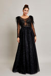 Vestido 100% poliéster, tul, brillo, cristales, pendientes, plumas
