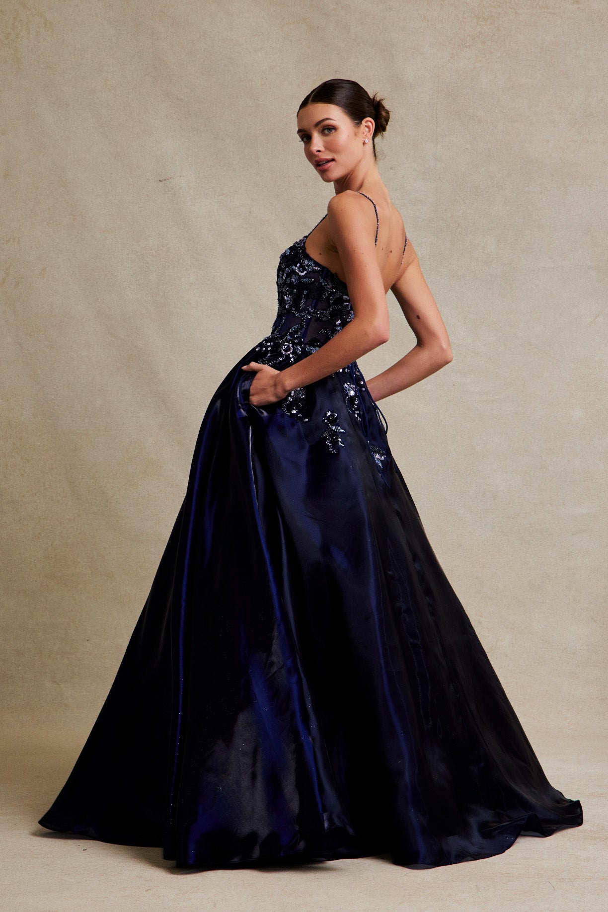 Vestido en Línea A con Tirante Bordado con Pedrería Color Navy