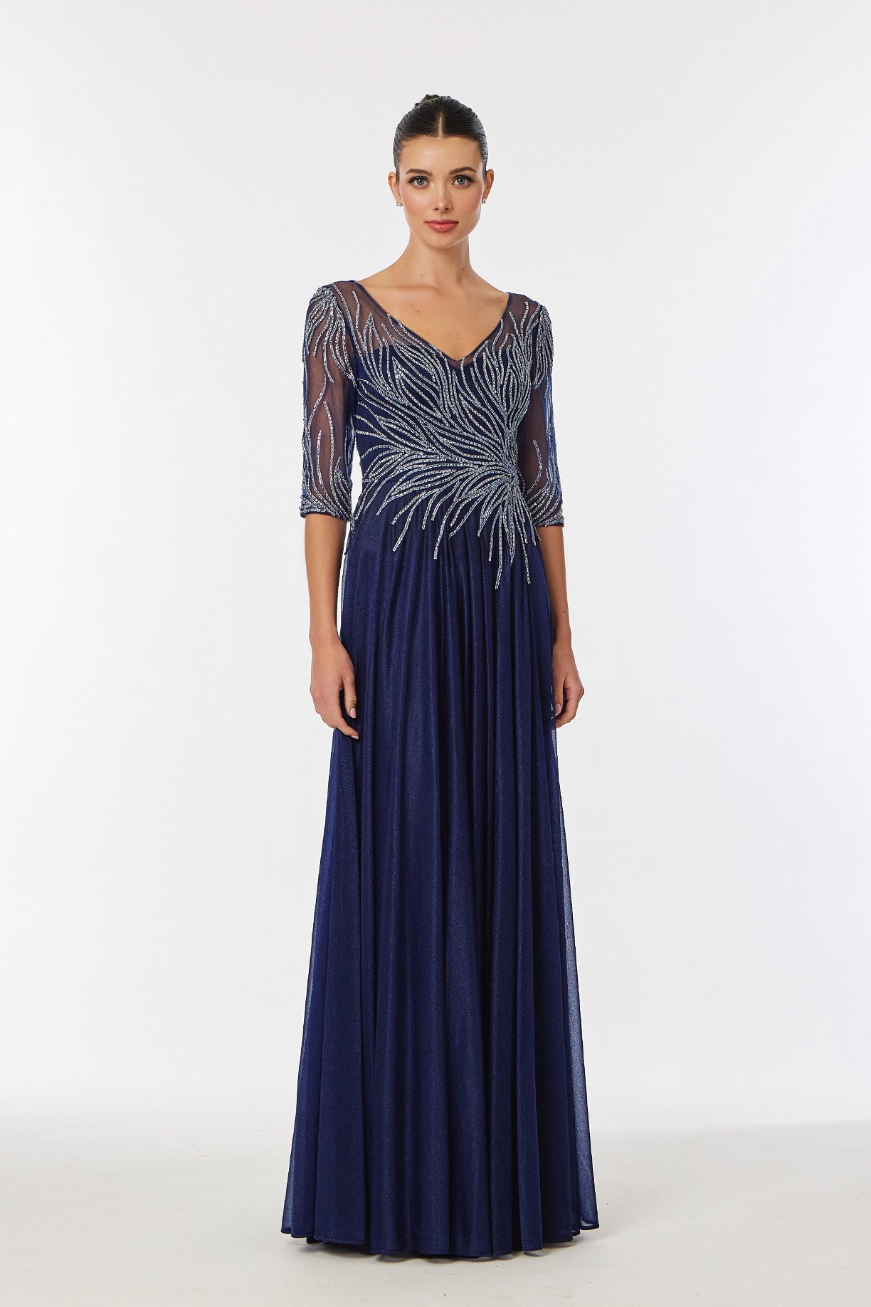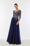 Vestido en Línea A Manga 3/4 y Cuello V Con decoraciones de Brillos. Color Navy.
